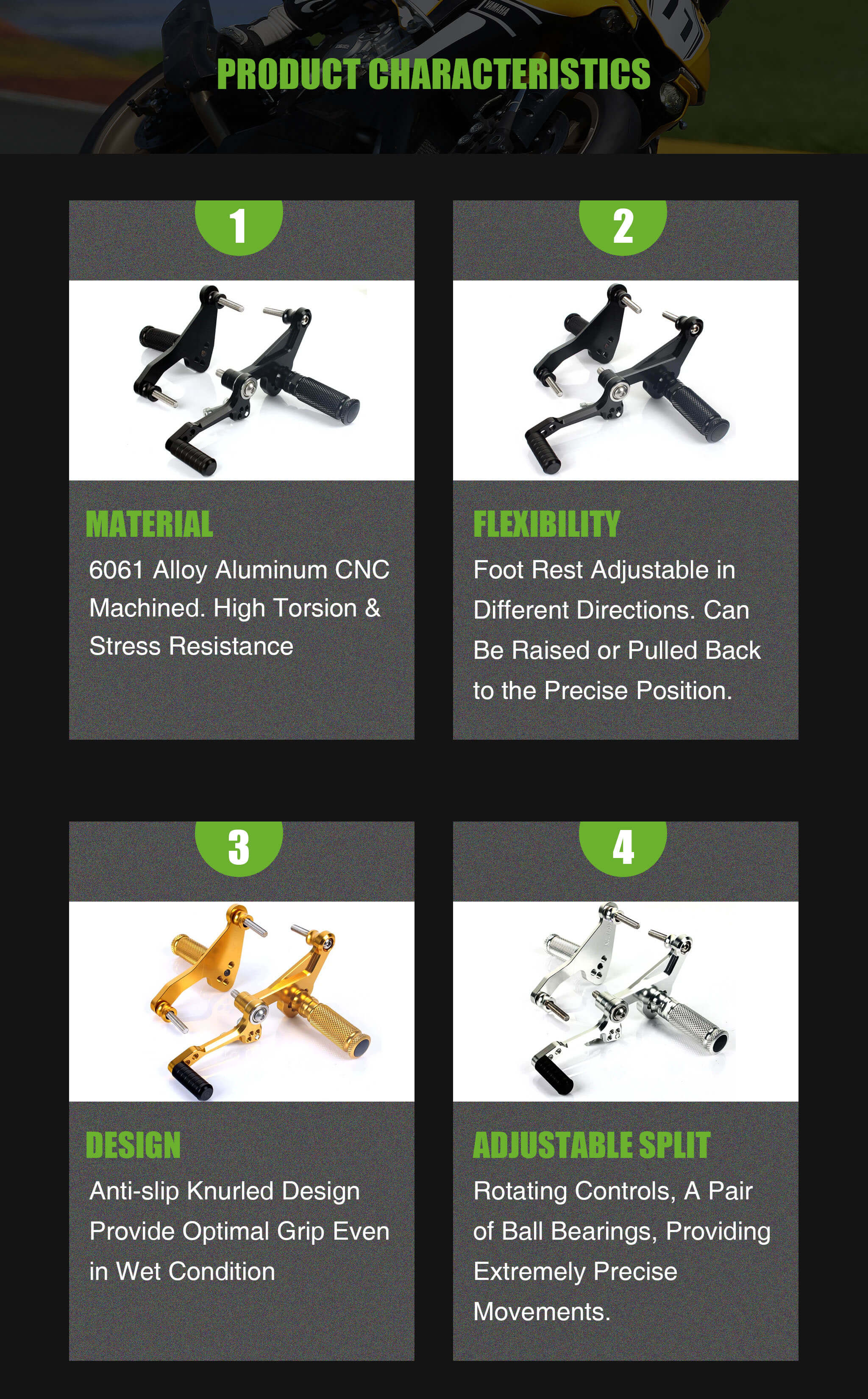 - Anti-slip knurled foot pegs for better grip even in wet condition